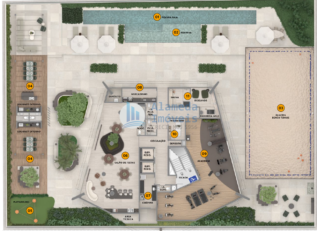 • Zeladoria e espaço de apoio com copa e vestiários para funcionários.
