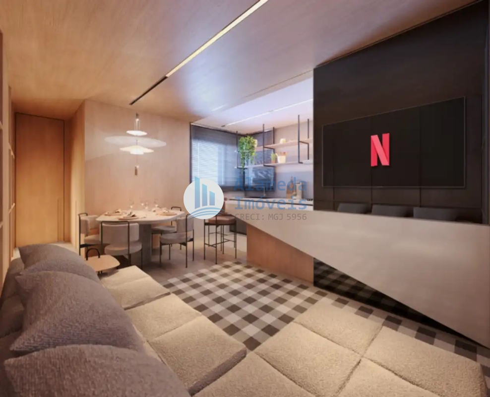Sala estar integrada com cozinha.